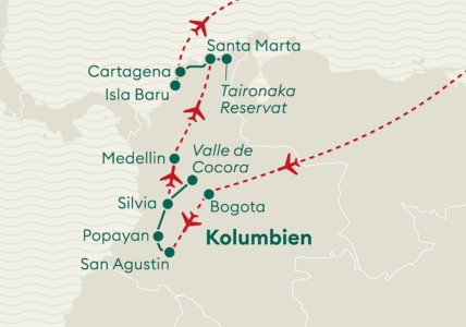 Direktflug nach Santa Marta, der zweitältesten Stadt Südamerikas. Santa Marta ist ebenfalls ein beliebtes Touristenziel wegen des Reichtums an Geschichte, kolonialer Architektur sowie den herrlichen Stränden.