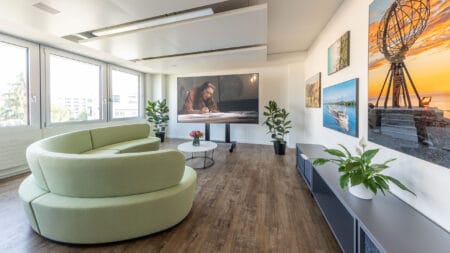 moderner, lichtdurchfluteter Büroraum mit Beratungstisch, Sofa und farbenprächtigen Bildern an der Wand